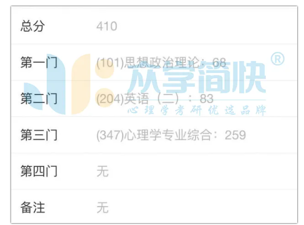 二战报名福州大学应用心理专硕,这次我紧跟课程安排的步伐,抓住暑假强化阶段,后期冲刺阶段也没有松懈,初试总分410分,专业课259分,排名第四,最后综合第三上岸。