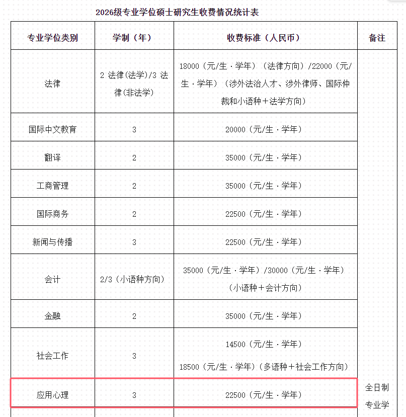 广东外语外贸大学应用心理专硕全日制学制3年,学费为22500元/(生·学年)。