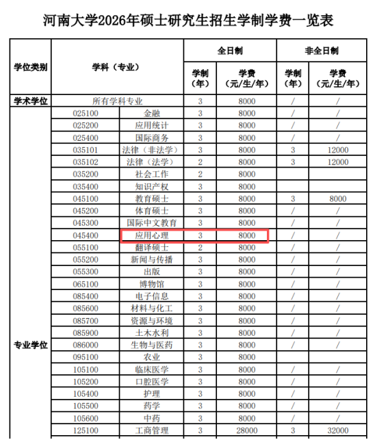 河南大学应用心理专硕全日制学制3年,学费为8000元/生/年。