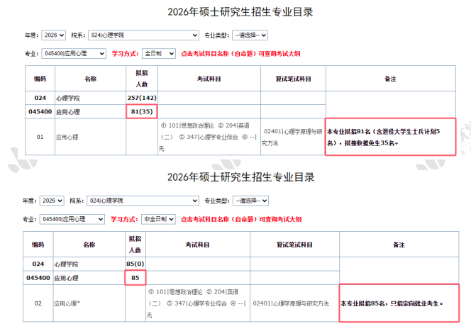 根据华南师范大学研究生招生信息网发布的《2026年硕士研究生招生专业目录》显示,华南师范大学心理学院应用心理专硕2026年计划招收81名全日制研究生(含退役大学生士兵计划5名),拟接收推免生35名;计划招收85名非全日制研究生,只招定向就业考生。初试不区分研究方向。