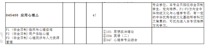 招生方向:F1临床与心理咨询、F2用户体验心理、F3心理测评与人力资源管理。F1-F3方向含中华传统文化与心理学专项,有一定的中华优秀传统文化基础和学科交叉背景的,可优先进入本专项培养方向学习。