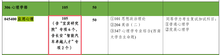 根据西南大学研究生招生网公布的《西南大学2026年硕士研究生招生章程及招生学科专业目录》,西南大学应用心理专硕2026年计划招收全日制105人(含“宜宾研究院”专项6个,含长安“智能汽车卓越人才”专项2个),其中拟接受推免生50人。初试不区分研究方向。