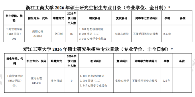 根据浙江工商大学研究生招生信息网《浙江工商大学2026年硕士研究生招生章程》公布,浙江工商大学应用心理专硕2026年计划招收全日制82人、非全日制9人。
