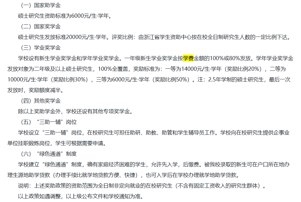 浙江工商大学全日制硕士研究生奖助体系包括国家助学金、国家奖学金、学业奖学金、其他奖学金、“三助一辅”岗位津贴,并设有“绿色通道”制度。