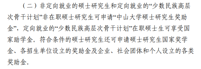 非定向就业的硕士研究生和定向就业的非在职硕士研究生可申请“中山大学硕士研究生奖助金”,定向就业的“少数民族高层次骨干计划”在职硕士生可享受国家助学金,符合条件的硕士研究生还可申请硕士研究生国家奖学金、各招生单位设立的奖助金及企业、社会团体和个人设立的各类奖助金。
