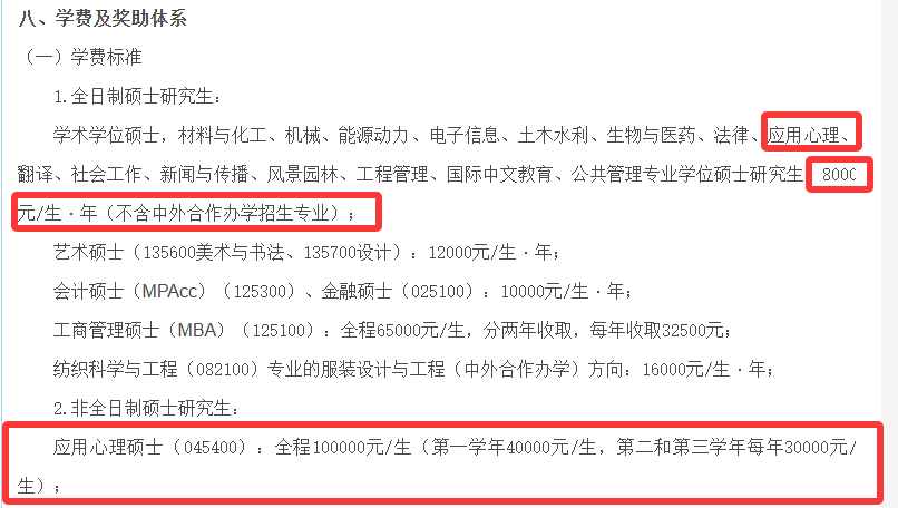 浙江理工大学应用心理专硕学制3年,全日制学费为8000元/生·年,非全日制学费为全程100000元/生(第一学年40000元/生,第二和第三学年每年30000元/生)。