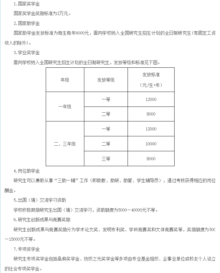 学校为全日制硕士研究生建有完善的奖助服务体系,包括国家奖学金、国家助学金、国家助学贷款、学业奖学金、岗位助学金(含助研、助教和助管等)、出国(境)交流学习资助、创新成果与竞赛奖励、专项奖学金等。
