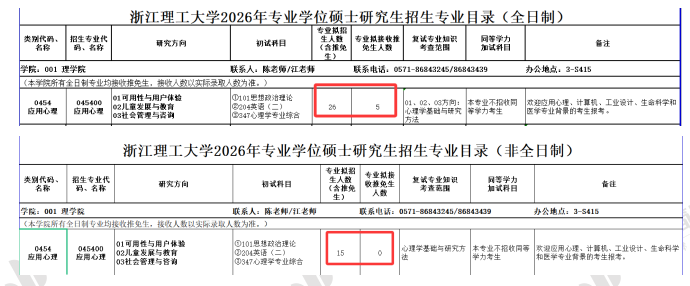 根据浙江理工大学研究生院官网《浙江理工大学2026年硕士研究生招生专业目录》,浙江理工大学应用心理专硕2026年计划招收全日制26人(含5推免)、非全日制15人。