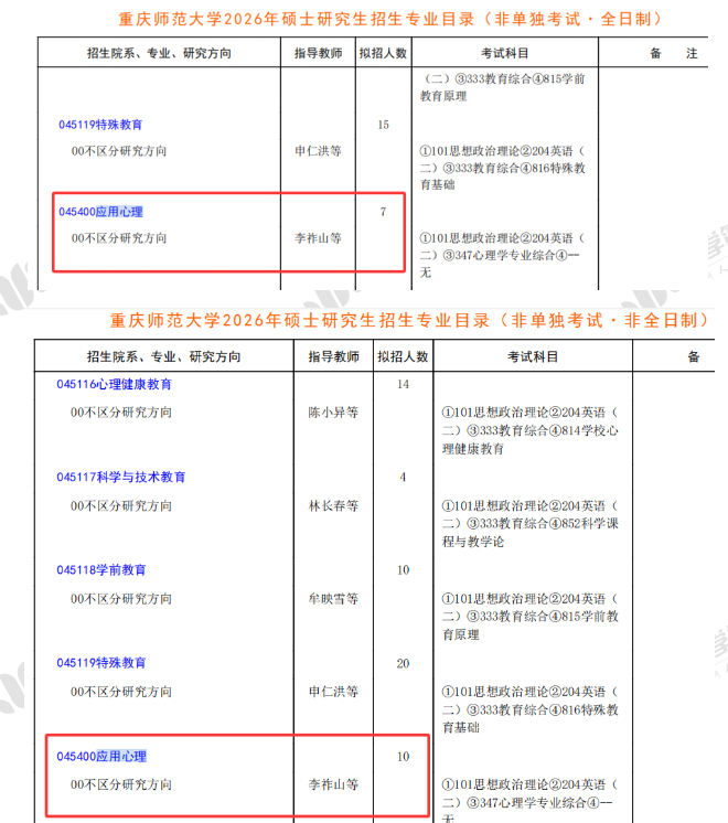 根据重庆师范大学研究生院官网《重庆师范大学2026年硕士研究生招生专业目录》,重庆师范大学2026年应用心理专硕计划招收全日制7人,非全日制10人。不区分研究方向。