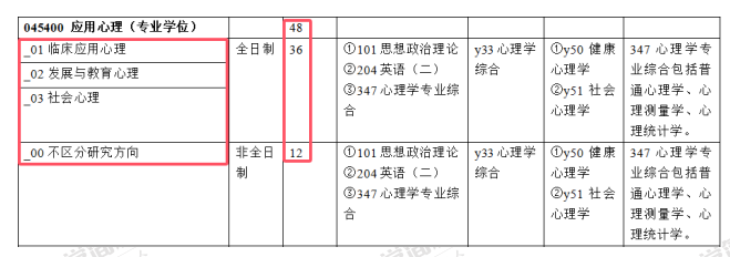 全日制研究方向分为:01临床应用心理、02发展与教育心理、03社会心理;非全日制不区分研究方向。