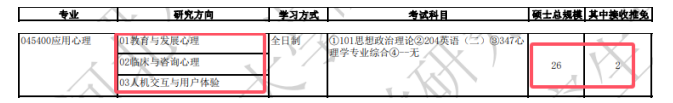 招生方向为:01教育与发展心理;02临床与咨询心理;03人机交互与用户体验。