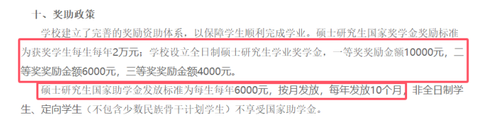 硕士研究生国家奖学金奖励标准为获奖学生每生每年2万元;学校设立全日制硕士研究生学业奖学金,一等奖奖励金额10000元,二等奖奖励金额6000元,三等奖奖励金额4000元。硕士研究生国家助学金发放标准为每生每年6000元,按月发放,每年发放10个月。