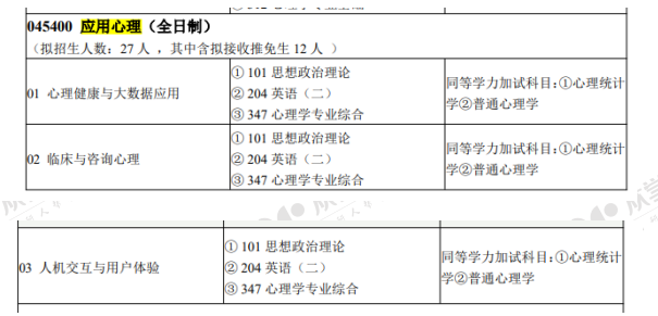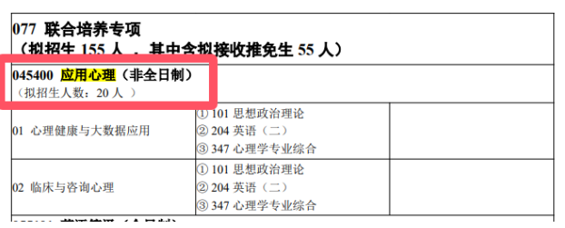 2026年新增非全日制招生,计划招收20人。研究方向分为:01心理健康与大数据应用、02临床与咨询心理。